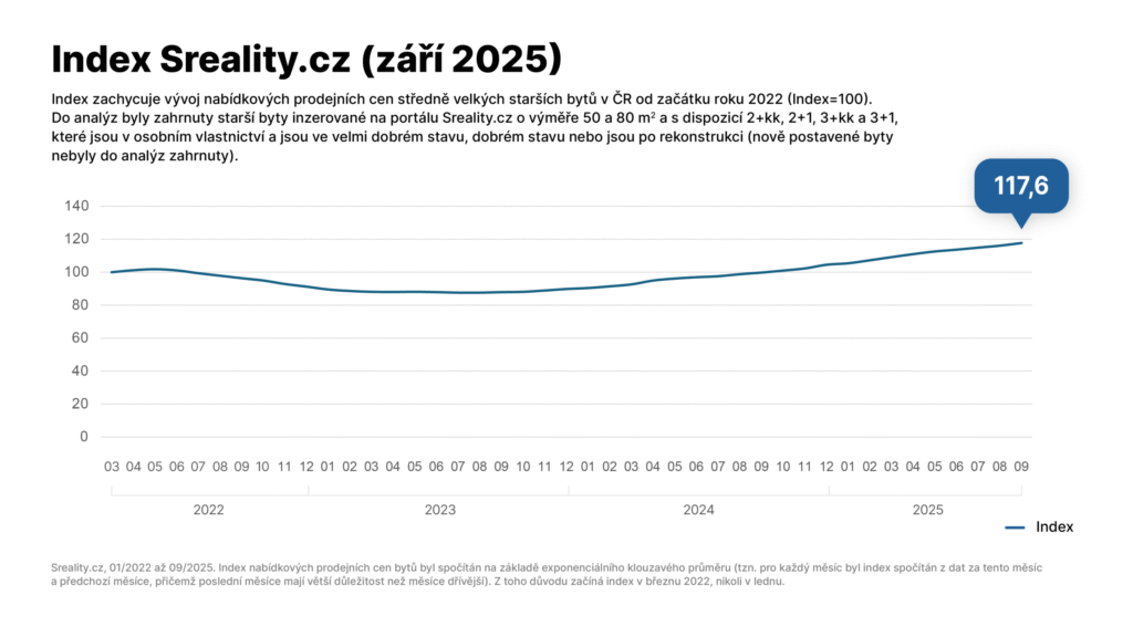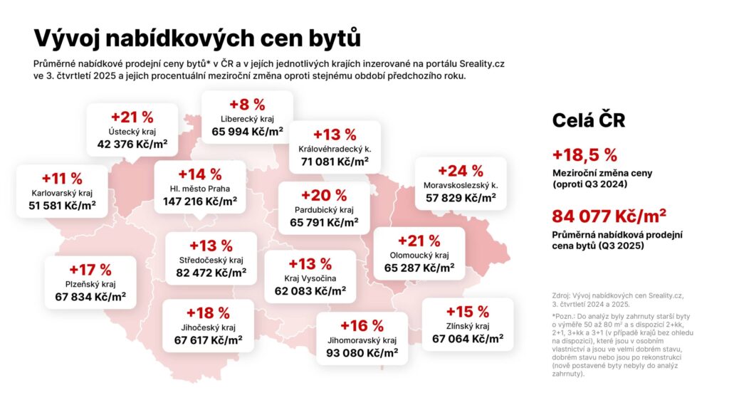 Ve třetím čtvrtletí roku 2025 byly nabídkové prodejní ceny středně velkých staršíchbytů* v České republice o 18,5 % vyšší než ve stejném období roku předcházejícího. Vyplývá to z aktuálních dat portálu Sreality.cz a Indexu Sreality.cz, který sleduje vývoj nabídkových cen bytů v celém Česku.Křivka růstu dle Indexu Sreality.cz v posledních měsících konstantně roste. V Moravskoslezském kraji byty dokonce meziročně zdražily téměř o čtvrtinu.