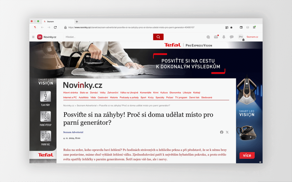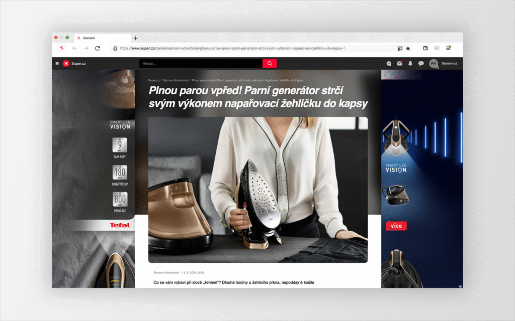 Proto jsme sáhli po formátech, které nejen upoutají, ale i vtáhnou. Statické bannery jsme doplnili o video a rich media. Hlavní hvězdou se stalo produktové video s carouselem, ve kterém si lidé mohli rovnou vybrat model a prokliknout se na web Tefalu, a to přímo z přehrávače. Aby se nehrálo jen na vizuální efekt, přidaly se i dva Advertorialy na Novinky.cz a Super.cz. Ty ukázaly výhody parních generátorů, vysvětlily, proč stojí za pozornost, a nabídly čtenářům víc než klasická reklama. RTB část kampaně cílila na ženy ve fázi zvažování nákupu, doplněno o širší zásah na ženské publikum.
