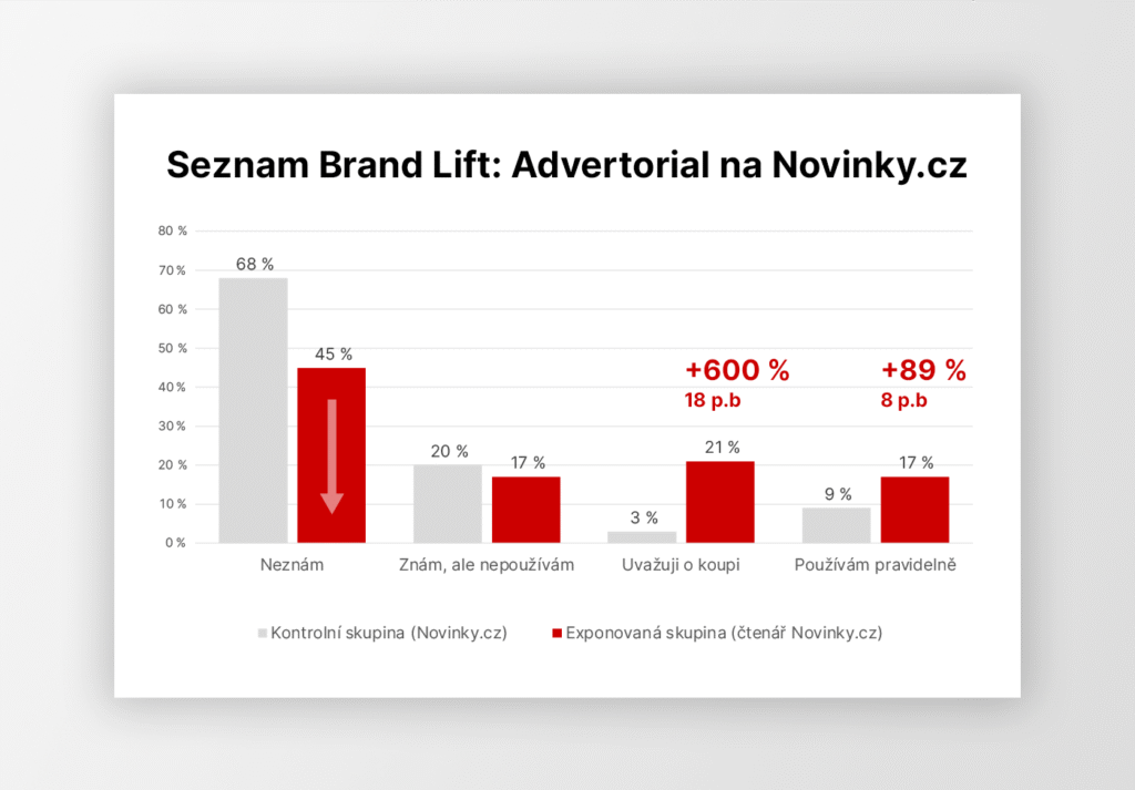 Tím ale zájem lidí nekončil. V anketě v rámci Seznam Brand Liftu se u čtenářů Advertorialu ukázalo, že podíl odpovědí „Uvažuji o koupi“ vzrostl o 350 % (14 p. b.) u Super.cz a u Novinek dokonce o 600 % (18 p. b.).