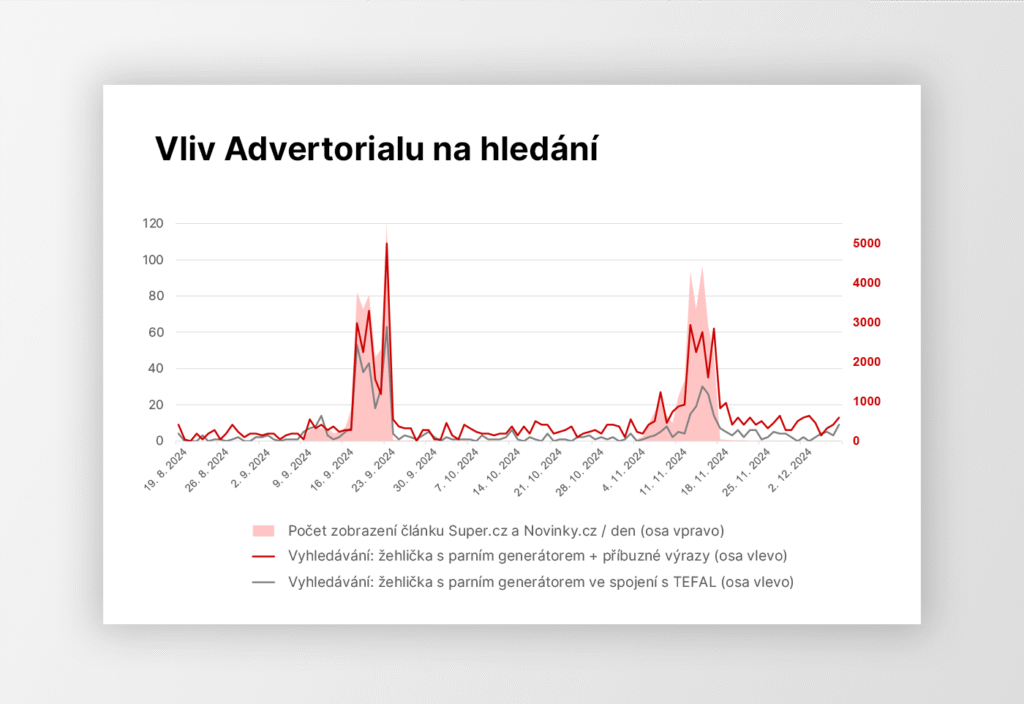 Čtenáři, kteří se z článku neproklikli přímo, si produkt dále aktivně vyhledávali. Tento typ aktivity v datech obvykle odpovídá fázím „Think“ a často i „Do“. Například díky publikaci na Super.cz došlo k nárůstu hledání až o 1 172 %. To ukazuje, že kvalitní obsahová kampaň typu Advertorial neovlivňuje pouze povědomí, ale i samotné rozhodování zákazníků v dalších krocích nákupní cesty.