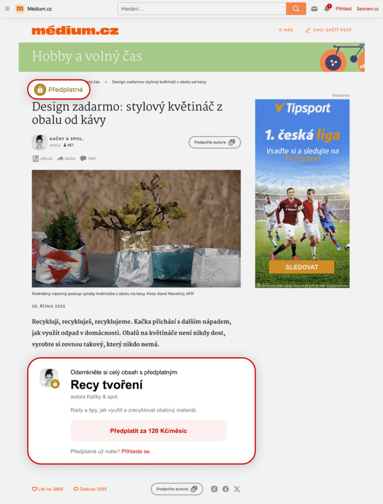 Seznam.cz spustí nové funkce na své blogovací platformě Médium.cz, která nabízí autorský obsah od samotných uživatelů. Nově budou moci čtenáři darovat finanční obnos vybranému autorovi textu skrze tlačítko Podpořit autora. Seznam.cz připravuje pro autory také možnost zamknout vlastní obsah za měsíční či jednorázové předplatné. Od září budou mít možnost tvůrci i publikum využívat novou funkci …