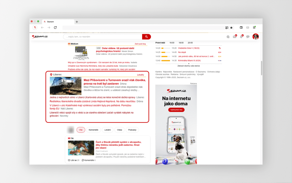 • Nový boxík umožní zobrazovat lokální články, tipy, akce nebo služby přesně podle toho, co je pro uživatele v dané oblasti nejzajímavější. Typicky třeba „Akce o víkendu v mém městě“. Věříme, že tím zlepšíme uživatelský zážitek a nabídneme kvalitní, personalizovaný obsah.