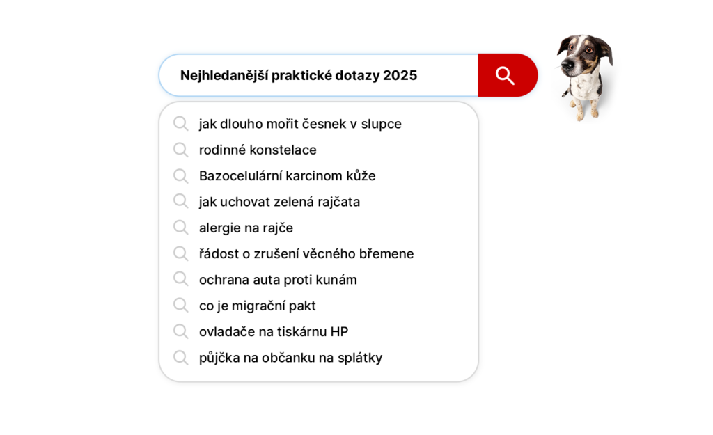Kategorie praktických dotazů poskytuje zajímavý náhled na to, jaké problémy jsme v roce 2025 v Česku řešili. Nebyla to inflace ani například výše důchodu, mnohem víc nás totiž zajímalo, jak dlouho mořit česnek ve slupce, jak uchovat zelená rajčata či ochránit auto proti kunám. Detaily jsme chtěli znát o písni Raketou na Mars od Věry Špinarové, lákala nás polská Mazurská jezera či Mayský měsíc a vědět jsme chtěli více o léčbě Parkinsonovy nemoci pomocí konopí.