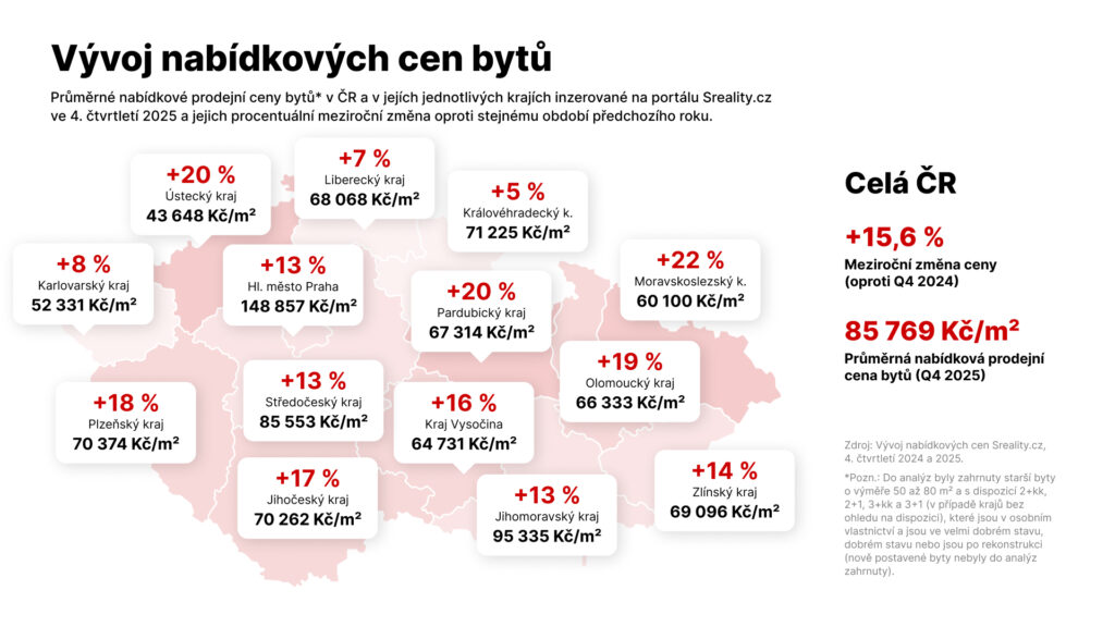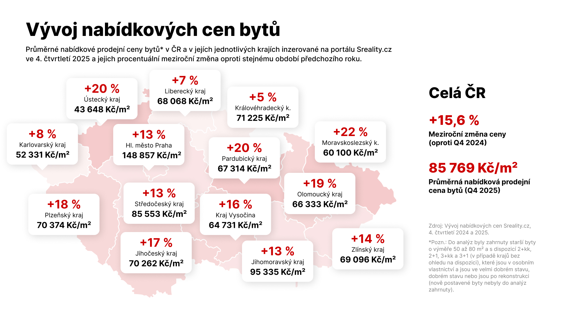 Ve čtvrtém čtvrtletí roku 2025 byly nabídkové prodejní ceny středně velkých staršíchbytů* v České republice o 15,6 % vyšší než ve stejném období roku předcházejícího. Vyplývá to z aktuálních dat portálu Sreality.cza Indexu Sreality.cz, který sleduje vývoj nabídkových cen bytů v celém Česku.Tentokrát jsme se zaměřili i na celoroční skokany v růstu cen bytů u krajů.Naprostým skokanem v růstu cen je Moravskoslezský kraj. Nejméně ceny rostly v Libereckém kraji.