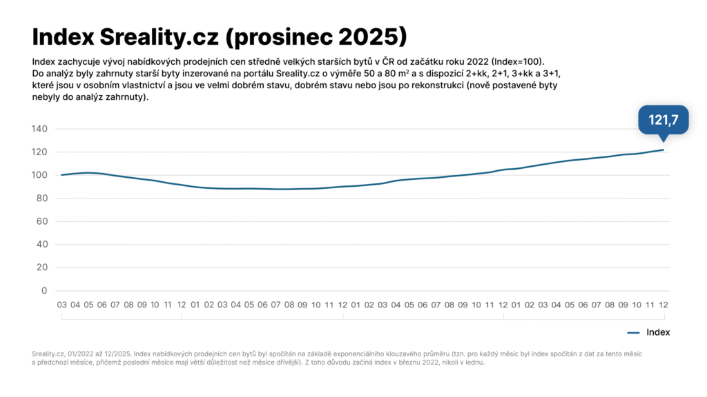 Růst cen bytů v roce 2025 je patrný i z Indexu Sreality.cz, který monitoruje vývoj nabídkových cen bytů v dlouhodobější perspektivě.
