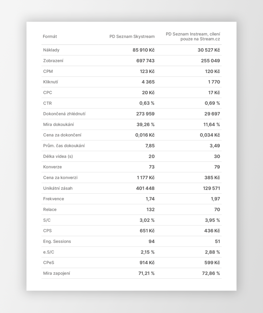 Youtube videa přinesla vysokou viditelnost brandových claimů, což potvrdila výborná completion rate 92 %. Seznam Dealy Instream a Skystream doplňovaly zásah – Skystream exceloval v completion rate a době dokoukání, zatímco Instream na Stream.cz přinesl lepší výsledky z hlediska konverzí a engaged sessions.