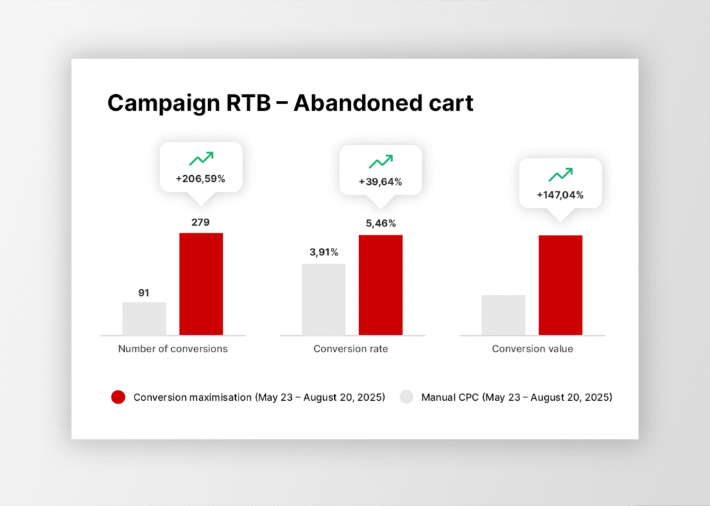 The Effectix team implemented the new strategy gradually, placing an emphasis on certainty and data evaluation. First, they switched one campaign and monitored its results. Only then did they extend the strategy to other retargeting segments. This approach enabled them to safely verify the functionality of the new strategy and optimise it gradually based on the obtained data.