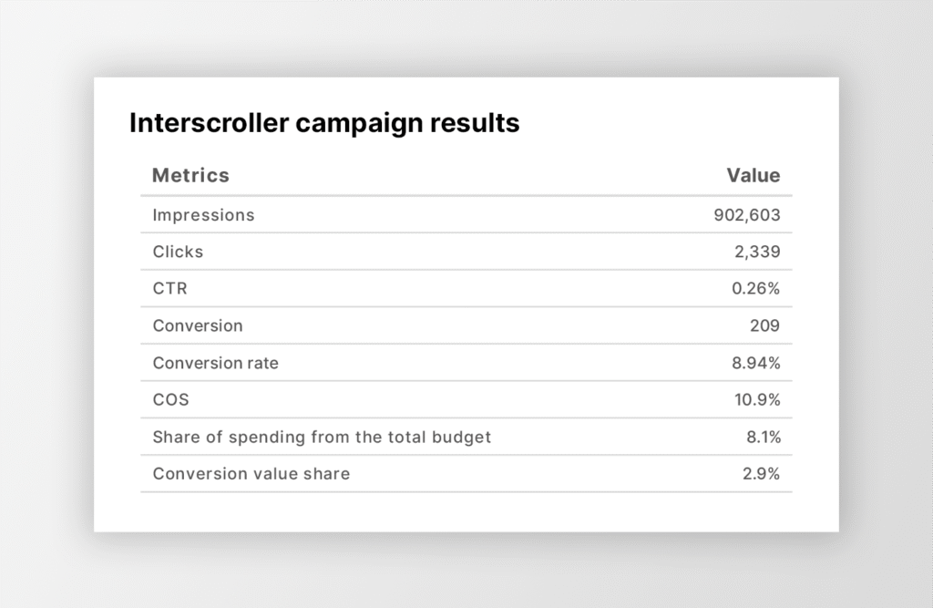 Even if you have a limited budget, don’t rule out premium, visible formats. When used correctly, Interscroller can outperform traditional banners in terms of both visibility and direct performance.
