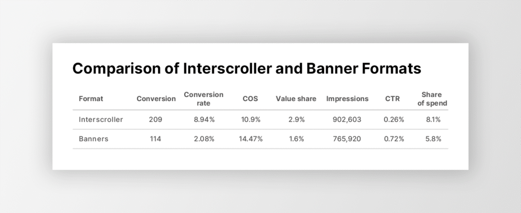 Interscroller delivered almost twice as many conversions as banners (209), as well as an 85% higher transaction value, with a COS of 10.9%. These results clearly demonstrate that a visible format can be more effective than a traditional banner.